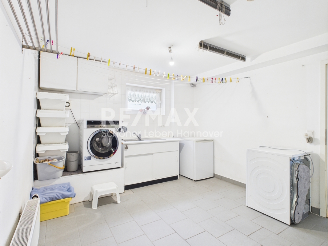 Der Keller verfügt über eine Grundfläche von ca. 74m² und besteht aus zwei Kellerräumen, einem Heizungsraum, einer Waschküche und einem dritten Badezimmer mit Dusche. Im Heizungsraum steht die 2008 erneuerte Gas-Heizung inkl. Warmwasserspeicher, der 2016 erneuert wurde und solarfähig ist. Es gibt zwei Ausgänge im Keller in den Garten, sowie einen weiteren Zugweg durch das Carport. Da der Keller früher als Firma genutzt wurde, verfügt dieser in einem Raum über alle Anschlüsse für eine Küche und es liegt ein Starkstromkabel. Alle Kellerräume sind gefliest. Die Kelleraußenwände wurde durch Gürtelpressung als nachträgliche Horizontalsperre im Jahr 2017 abgedichtet. Dieses wurde unternommen, da der Grundwasserspiegel in Vinnhorst bei Dauerregen sehr hoch ist.