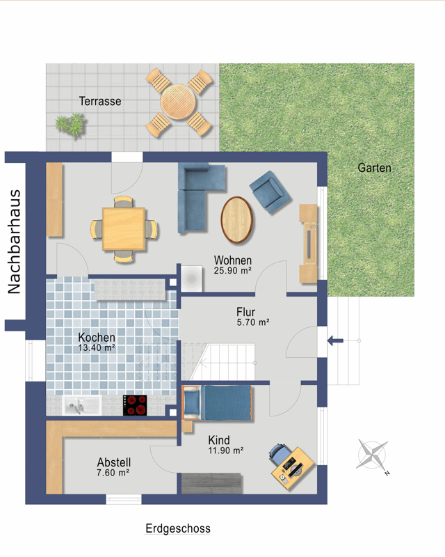 Kommt man in das Haus, ist man im Flur mit der Treppe zum Obergeschoss. Gleich links erreicht man ein Kinderzimmer, hinter dem sich ein Abstellraum als gefangenes Zimmer befindet. Rechts am Eingang ist eine Tür zum Wohnzimmer, die aber zurzeit nicht genutzt wird. Sie ist sie von der anderen Seite mit Möbeln verstellt. Die Küche am Flurende ist mit gut 13 m² geräumig und lässt sich als Wohnküche nutzen. In der Küche ist die Treppe zum Teilkeller, der einen dem Baujahr entsprechenden Zustand aufweist. Aufgrund der derzeitigen Einrichtung gelangt man hinter der Küche in das Esszimmer, das sich nach vorne hin zum Wohnzimmer öffnet. Im Esszimmer ist die Terrassentür, die zum Garten führt. Im Wohnzimmer befindet noch ein Kachelofen, der allerdings nicht in Betrieb ist. Im Erdgeschoss befinden sich in der Summe 4 Zimmer: Wohnzimmer, Essbereich, ein Kinderzimmer und ein Abstellraum, der auch als kleines Büro genutzt werden könnte.