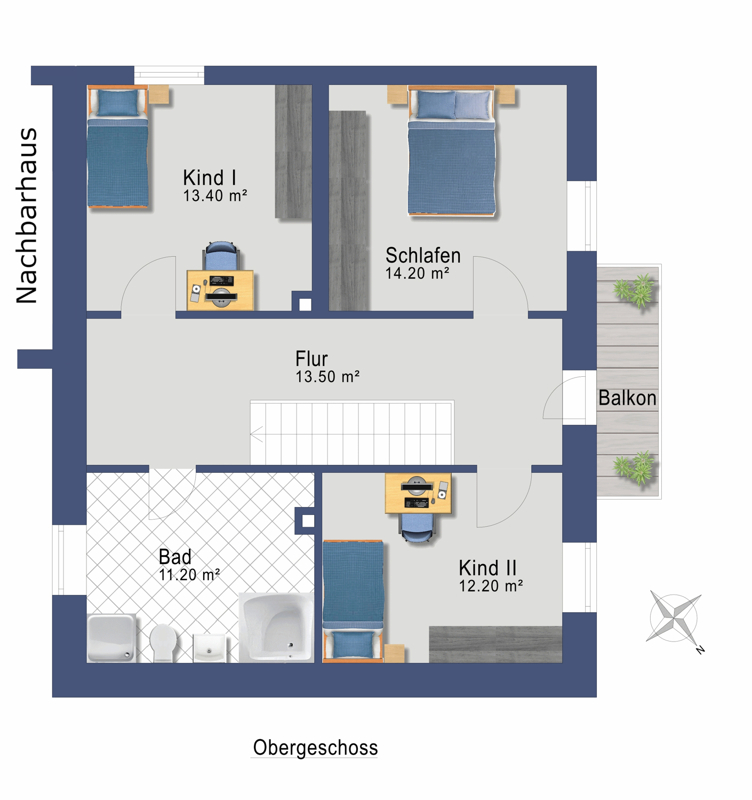 Im Obergeschoss befinden sich 3 Schlafzimmer. Sie werden als elterliches Schlafzimmer und 2 als Kinderzimmer genutzt. Das 11 m² große, freundliche Badezimmer wurde renoviert und ist mit Eck-Badewanne, Dusche, Waschbecken ausgestattet. Nach vorne zur Straße erreicht man vom Flur den kleinen Balkon. Über eine Falltreppe im Flur kommt man auf den Spitzboden.