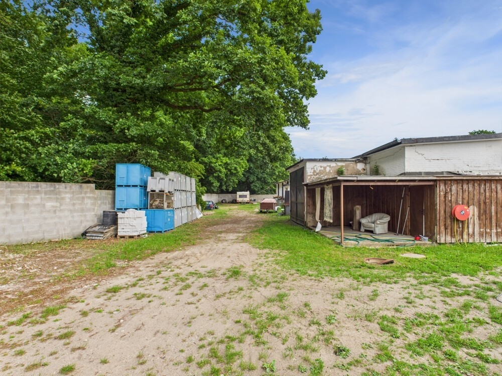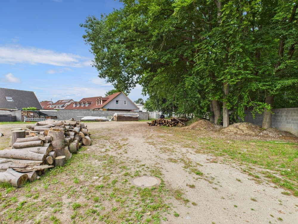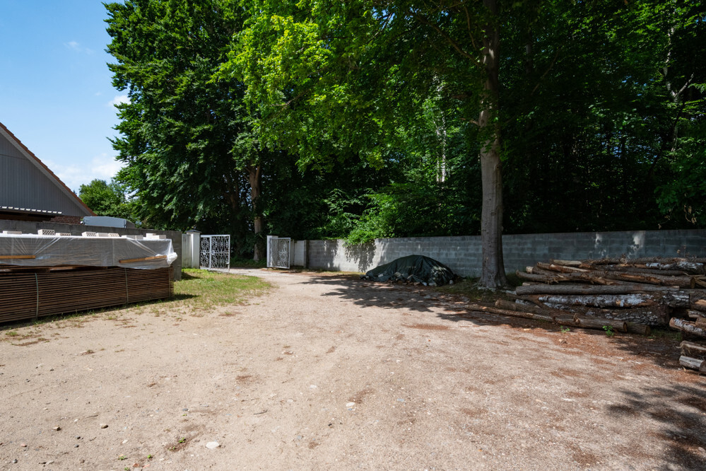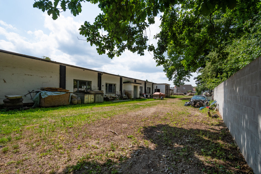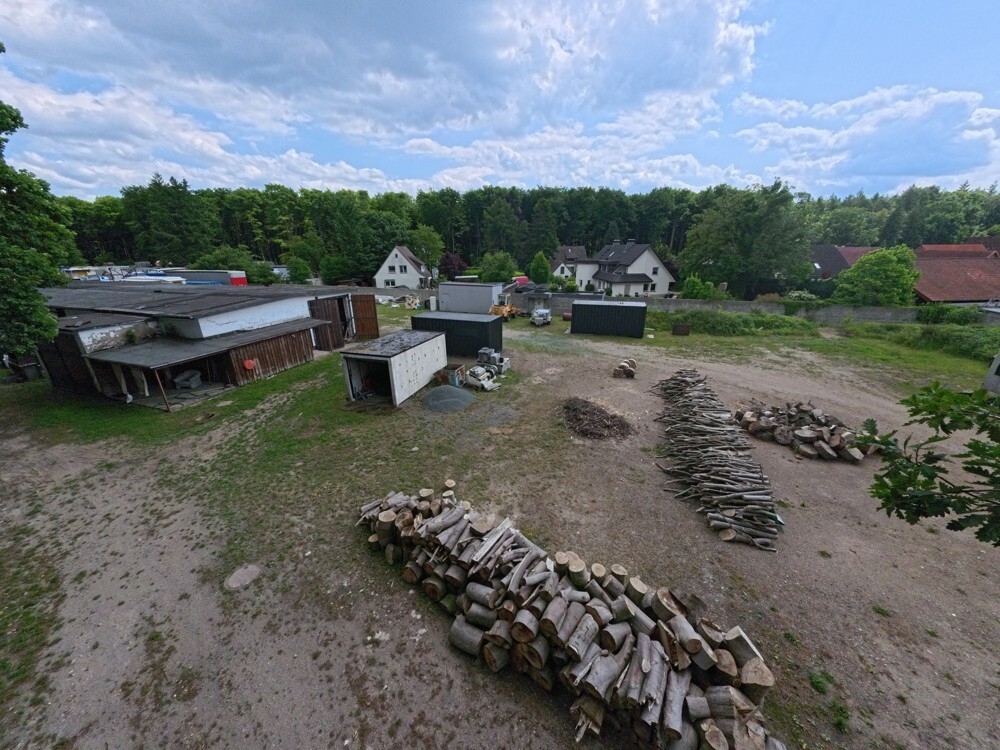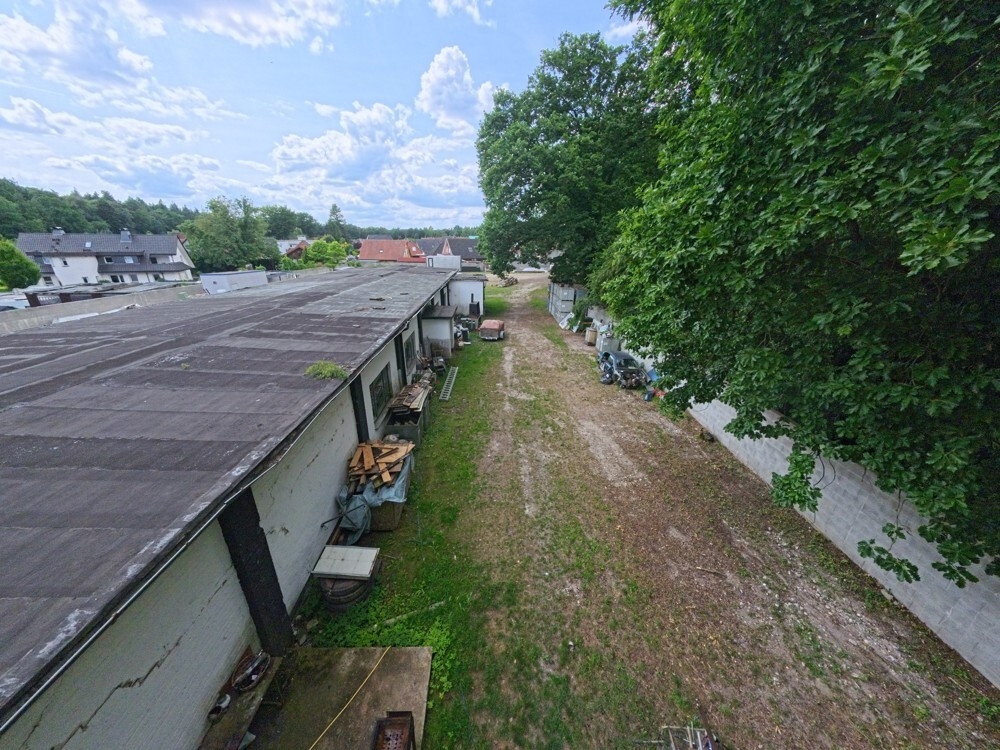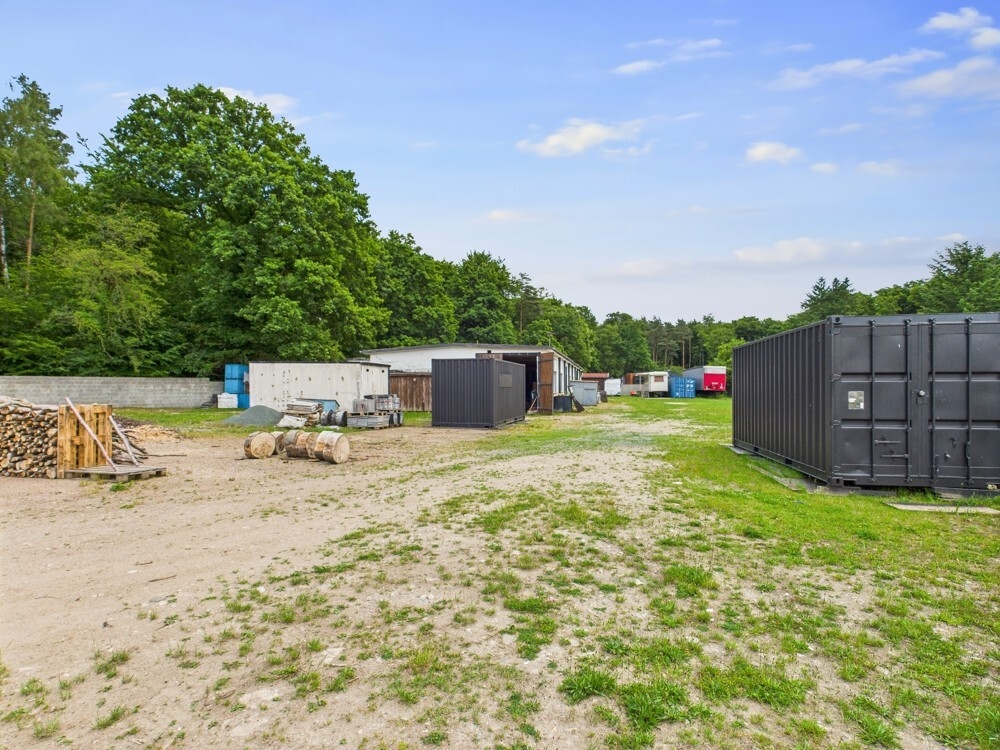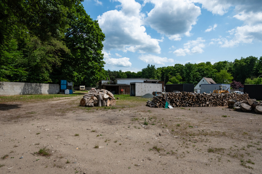 Der Außenbereich ist weitläufig und bietet ausreichend Platz für Erweiterungen oder zusätzliche Lagermöglichkeiten. Die Umgebung ist von viel Grün umgeben, was dem Gelände eine angenehme Atmosphäre verleiht.
