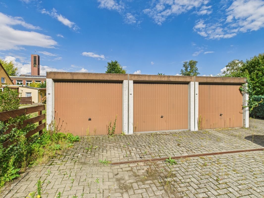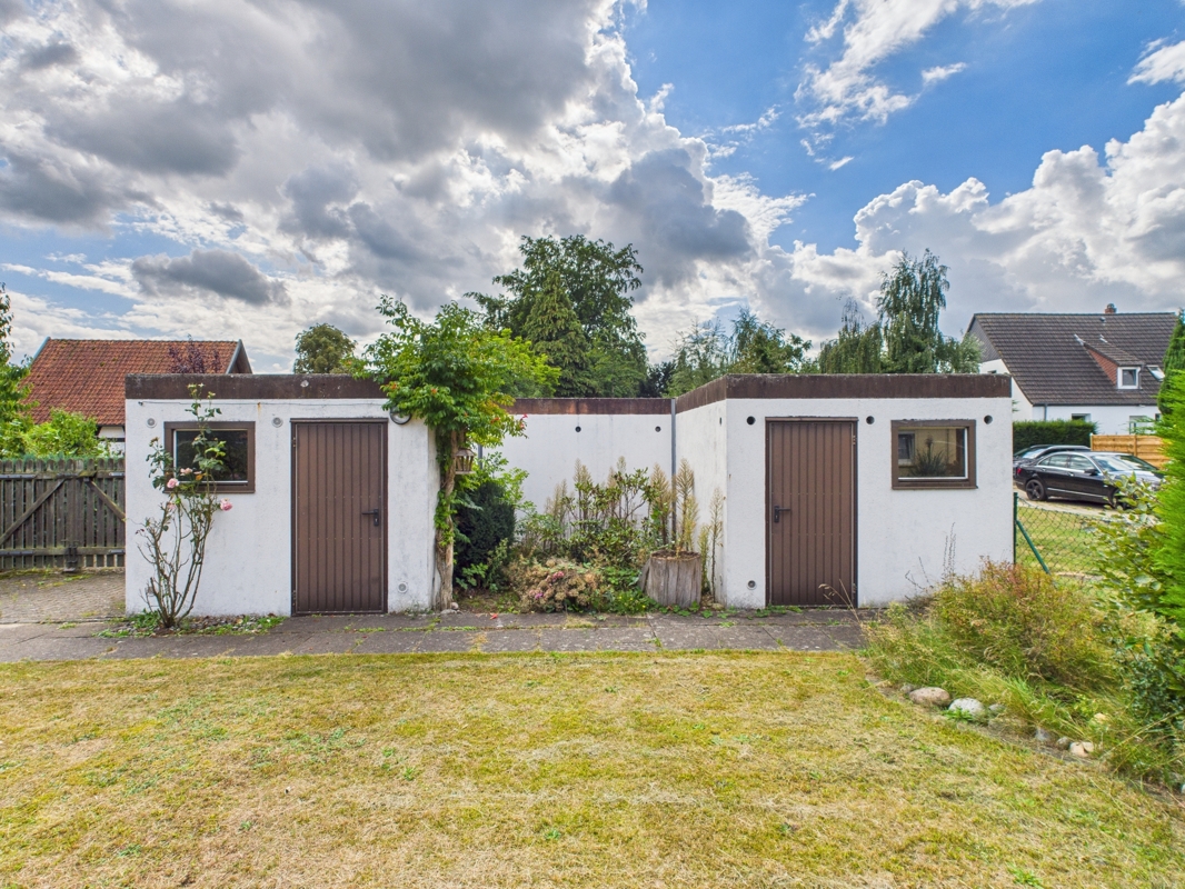 Ebenso dazu gehören 3 Garagen mit Stellflächen davor, die Einblicke in den Garten verwehren, und zwei Geräteräume für Fahrräder oder Gartengeräte.
